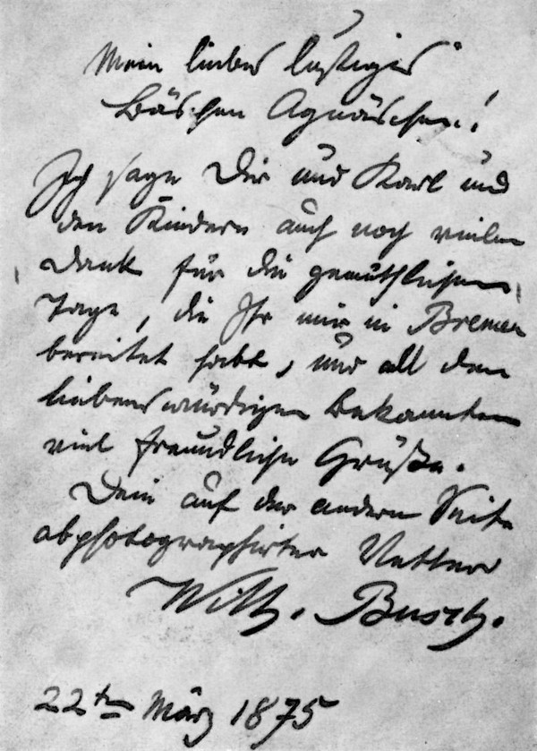 Ich sage Dir und Karl und den Kindern auch noch vielen Dank für die gemüthlichen Tage, die Ihr mir inBremen bereitet habt, und all den liebenswürdigen Bekannten viel freundliche Grüße.