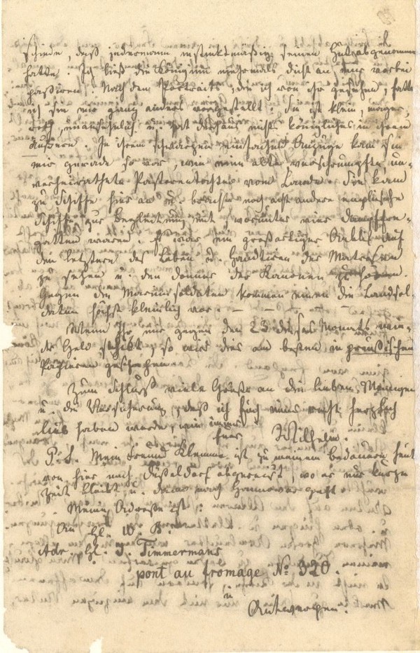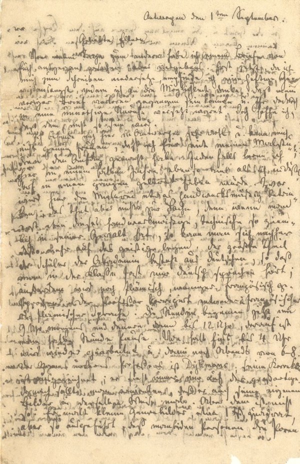 Von einem Tage zum andern habe ich einem Briefe von Euch entgegen gesehen, aber vergebens. Erst jetzt, da ich mich zum Schreiben niedersetze, empfinde ich eine heftige Gewißensangst, indem ich an die Möglichkeit denke, daß mein voriger Brief verloren gegangen sein könnte u. Ihr dadurch in eine unnöthige Unruhe versetzt wäret. Doch hoffe ich, daß dem nicht so sein wird.