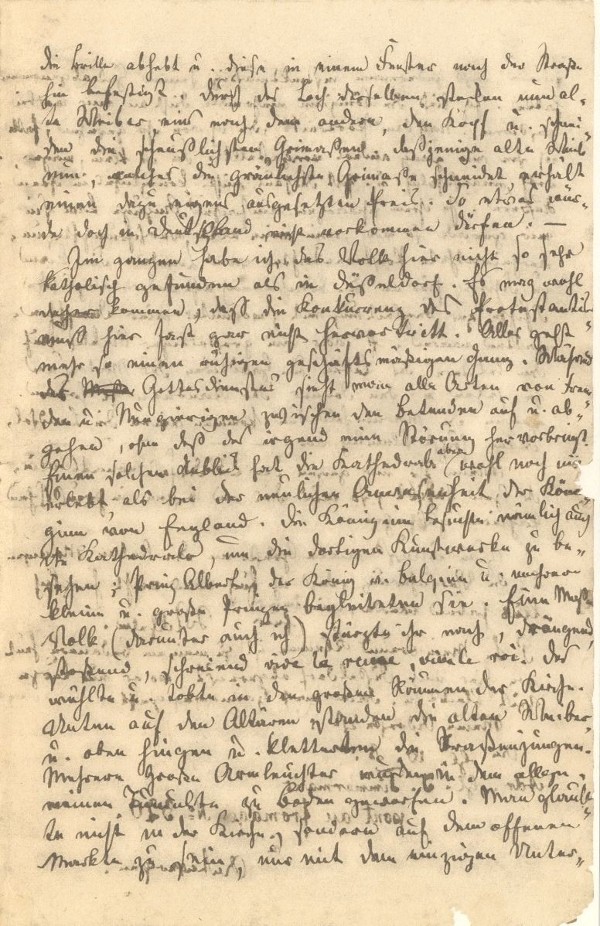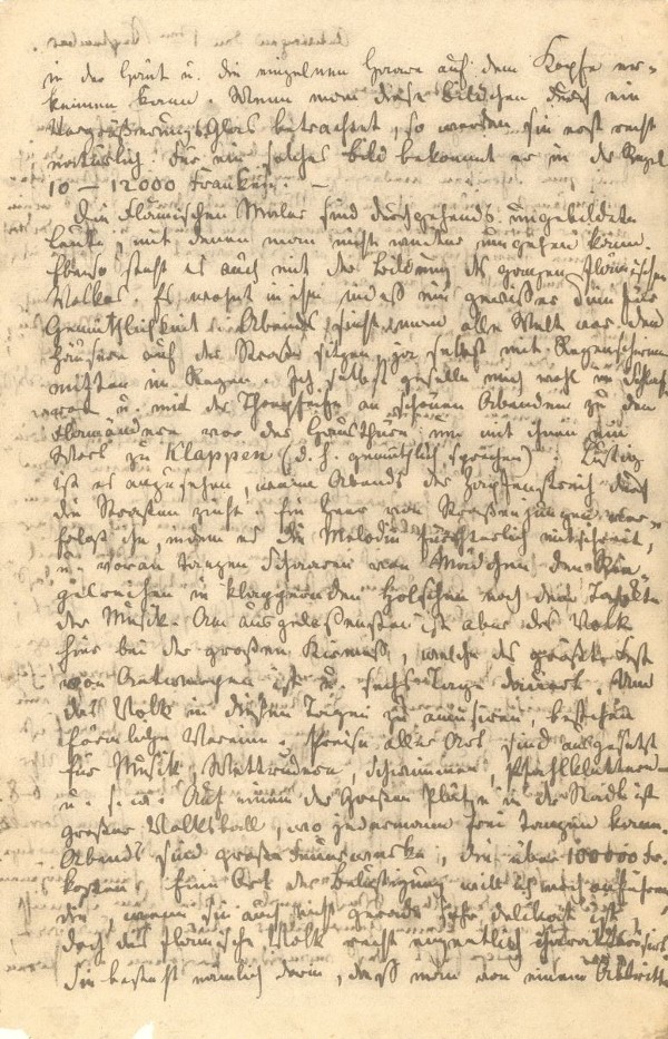 Die Flämischen Maler sind durchgehends ungebildete Leute, mit denen man nicht weiter umgehen kann. Ebenso steht es auch mit der Bildung des ganzen flämischen Volkes. Es wohnt in ihm indeß ein gewißer Sinn für Gemüthlichkeit. Abends sieht man alle Welt vor den Häusern auf der Straße sitzen, ja selbst mit Regenschirmen mitten im Regen. Ich selbst geselle mich wohl im Schlafrock u. mit der Thonpfeife an schönen Abenden zu den Flamändern vor der Hausthüre, um mit ihnen ein Wort zu klappen (d.h. gemüthlich sprechen). Lustig ist es anzusehen, wenn Abends der Zapfenstreich durch die Straßen zieht. Ein Heer von Straßenjungen verfolgt ihn, indem es die Melodie fürchterlich mitschreit, u. voran tanzen Schaaren von Mädchen den Ringelreihen in klappernden Holschen nach dem Tackte der Musik. Am ausgelaßensten ist aber das Volk hier bei der [4] großen Kirmeß, welche das größte Fest von Antwerpen ist u. sechs Tage dauert. Um das Volk in diesen Tagen zu amüsiren, bestehen förmliche Vereine. Preise aller Art sind ausgesetzt für Musik, Wettrudern, Schwimmen, Pfahlklettern – u.s.w. Auf einem der Großen Plätze in der Stadt ist großer Volksball, wo jedermann frei Tanzen kann. Abends sind große Feuerwerke, die über 100000 Fr. kosten. Eine Art der Belustigung will ich noch anführen, die, wenn sie auch nicht gerade sehr delikat ist, doch das flämische Volk recht eigentlich charakterisirt. Sie besteht nämlich darin, daß man von einem Abtritte die Brille abhebt u. diese in einem Fenster nach der Straße hin befestigt. Durch das Loch derselben stecken nun alte Weiber, eins nach dem andern, den Kopf u. schneiden die scheußlichsten Grimaßen. Daßjenige alte Weib nun, welches die gräulichste Grimaße schneidet, erhält einen dazu eigens ausgesetzten Preis. So etwas würde doch in Deutschland nicht vorkommen dürfen. –