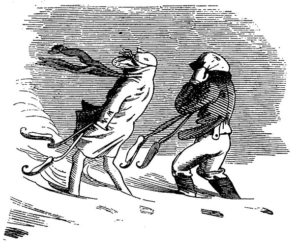Es war einmal ein unvernünftig kalter Winter; da gingen zwei gute Kameraden miteinander auf das Eis zum Schlittschuhlaufen. Nun waren aber hin und wieder Löcher in das Eis geschlagen, der Fische wegen; und als die beiden Schlittschuhläufer in vollem Zuge waren, sintemalen der Wind auch heftig blies, versah's der eine, rutschte in ein Loch und traf so gewaltsam mit dem Halse an die scharfe Eiskante, daß der Kopf auf das Eis dahinglitschte und der Rumpf ins Wasser fiel. Der andere, schnell entschlossen, wollte seinen Kameraden nicht im Stich lassen, zog ihn