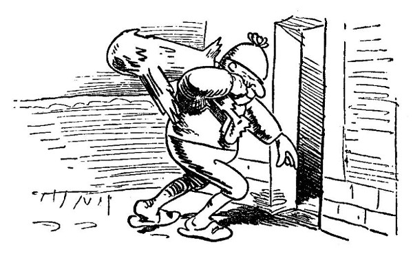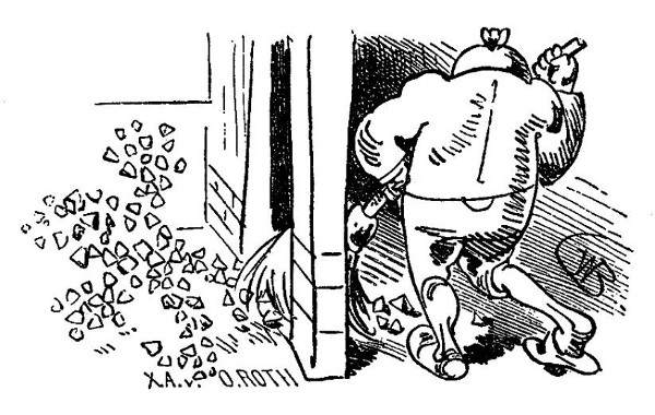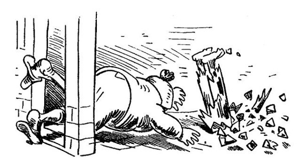 Bauz! Klirr! – er stolpert an der Schwelle;