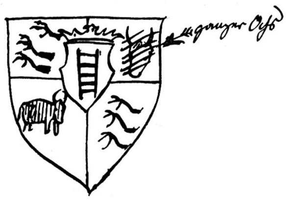 Darauf findet sich das schaumb. Wappen und dasOynhaus. Wappen. In diesem letztern befinden sich auch solche 3 Fänge oder Krallen, wie in dem einen Wappen, welches ich Ihnen neulich aus der Loccumer Kirche zuschickte [11] und welches Sie nicht kannten, nur daß die Krallen bei diesem letztern nach unten gerichtet waren. Sollten die beiden nichts mit einander zu thun haben? Hier eine ungefähre Skizze:
