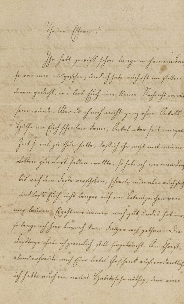 Ihr habt gewiß schon lange nach einem Briefe von mir ausgesehen, und ich habe auch oft im stillen daran gedacht, wie lieb Euch eine kleine Nachricht von mir sein würde. Aber da ich noch nicht ganz ohne Onkels Hülfe an Euch schreiben kann, Onkel aber seit einiger Zeit so viel zu thun hatte, daß ich ihn nicht mit meinen Bitten zur Last fallen wollte, so habe ich meinen Brief bis nach dem Feste verschoben, schreibe nun aber auch gleich und laße Euch nicht länger auf ein Lebenszeichen von mir lauren. Es geht mir immer noch gut, und es hat mir, so lange ich hier bin, noch kein Finger weh gethan. Die Festtage habe ich ziemlich still hingebracht. Am Christabend erfreute mich Euer liebes Geschenk außerordentlich; ich hatte auch ein neues Habit sehr nöthig; denn eine meiner Hosen war mir gar zu eng und kurz geworden und dazu sehr zerrißen, deshalb kam mir die neue Hose sehr erwünscht; auch über das schöne Buch mit dem hübschen Einbande habe ich mich sehr gefreut und will auch recht viel daraus lernen. Ich war aber der Einzige, dem der Christmann seine milde Hand aufgethan hatte, denn weder Onkel, noch Tante, noch der kleine Junge haben etwas bekommen. Den ersten Festtag Nachmittag brachte ich bei meinem Freunde Erich, dem Sohne des Müllers Bachmann zu, denn Onkel hatte eine Kindtaufe in Radolfshausen bei dem dortigen Obervogte, wohin ich nicht mitgehen konnte. Am zweiten Weihnachtstage waren wir nach dem Amte eingeladen, und da ich daselbst mehre Kinder traf, war ich sehr vergnügt. Ich habe jetzt in einem Theile meiner Stunden, nämlich Nachmittags, noch einen Gefährten bekommen, wodurch es sich um so beßer lernen läßt, weil der eine es immer noch beßer machen will, als der andere. Ferien haben wir aber in dieser Zeit nicht gehabt; bloß den letzten Tag vor den Festtagen hatten wir keine Stunden. Wir gehen aber auch eben so gern in die Stunden, als daß wir frei haben.
