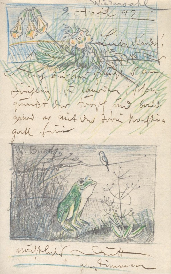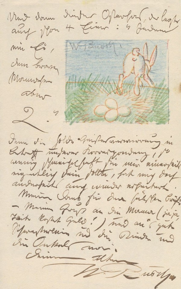 Auch bei uns fängt es an, Frühling zu werden; schon quackt der Frosch, und bald wird er mit der Frau Nachtigall sein nächtliches Duett anstimmen. Und dann dieser Osterhas, der legte auch schon 4 Eier: »Jedem ein Ei, dem braven Mamachen aber 2.« Denn die holde Geistesverwirrung in Betreff unserer Korrespondenz, so wenig schmeichelhaft sie mir einerseits eigentlich sein sollte, hat mich doch anderseits auch wieder erheitert. Meinen Dank für den hübschen Brief! – Meinen Gruß an die Mama (ja ja, Tinte kostet Geld!) und an's gute Schwesterlein und die Kinder und die Onkels von