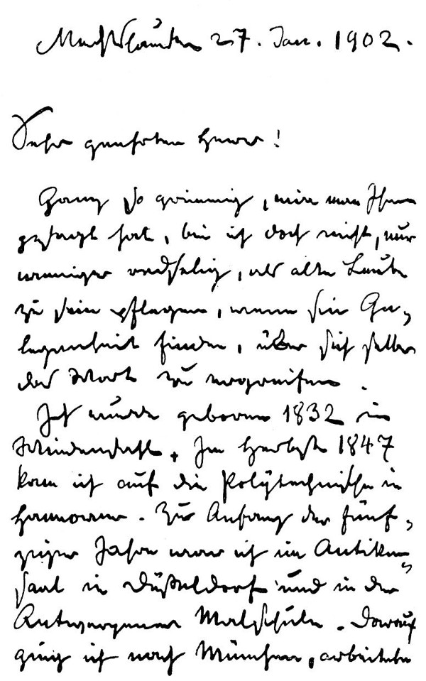 Ich wurde geboren 1832 in Wiedensahl. Im Herbst 1847 kam ich auf die Polytechnische in Hannover. Zu Anfang der fünfziger Jahre war ich im Antikensaal in Düßeldorf und in der Antwerpener Malschule. Darauf ging ich nach München, arbeitete für die Fliegenden, zeichnete meine Bilderbogen und machte mit Max u. Moritz den Anfang der längeren Bildergeschichten.