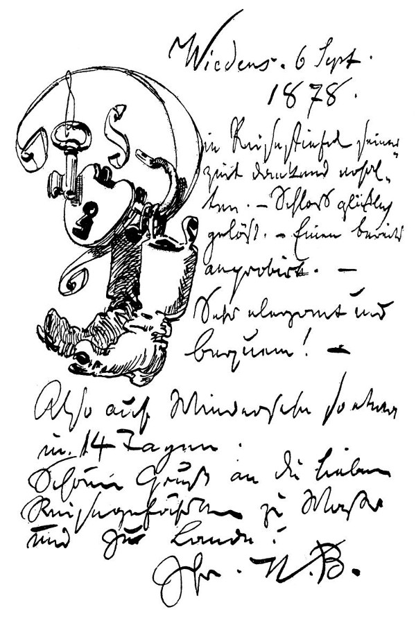 Die Reisestiefel seinerzeit dankend erhalten. – Schloß glücklich gelöst. –