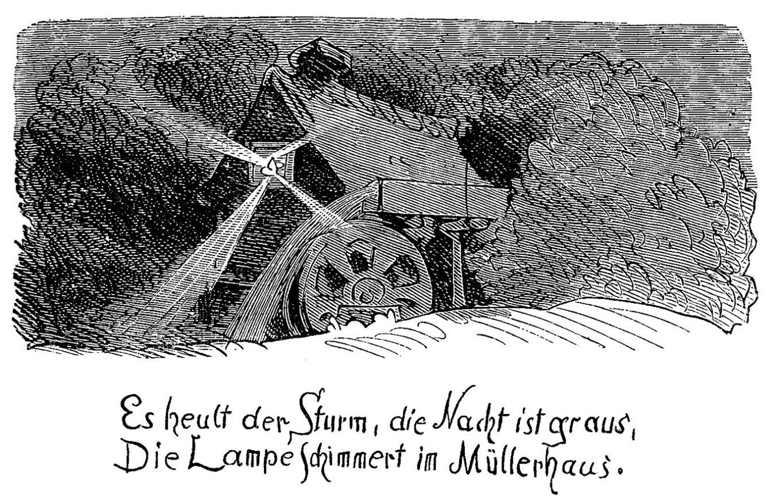 - TextGrid Repository (2012). Busch, Wilhelm. Bildergeschichten. Die kühne Müllerstochter. Es heult der Sturm, die Nacht ist graus, Die Lampe schimmert im Müllerhaus.. TextGrid Digitale Bibliothek. TextGrid. https://hdl.handle.net/11858/00-1734-0000-0006-3141-5