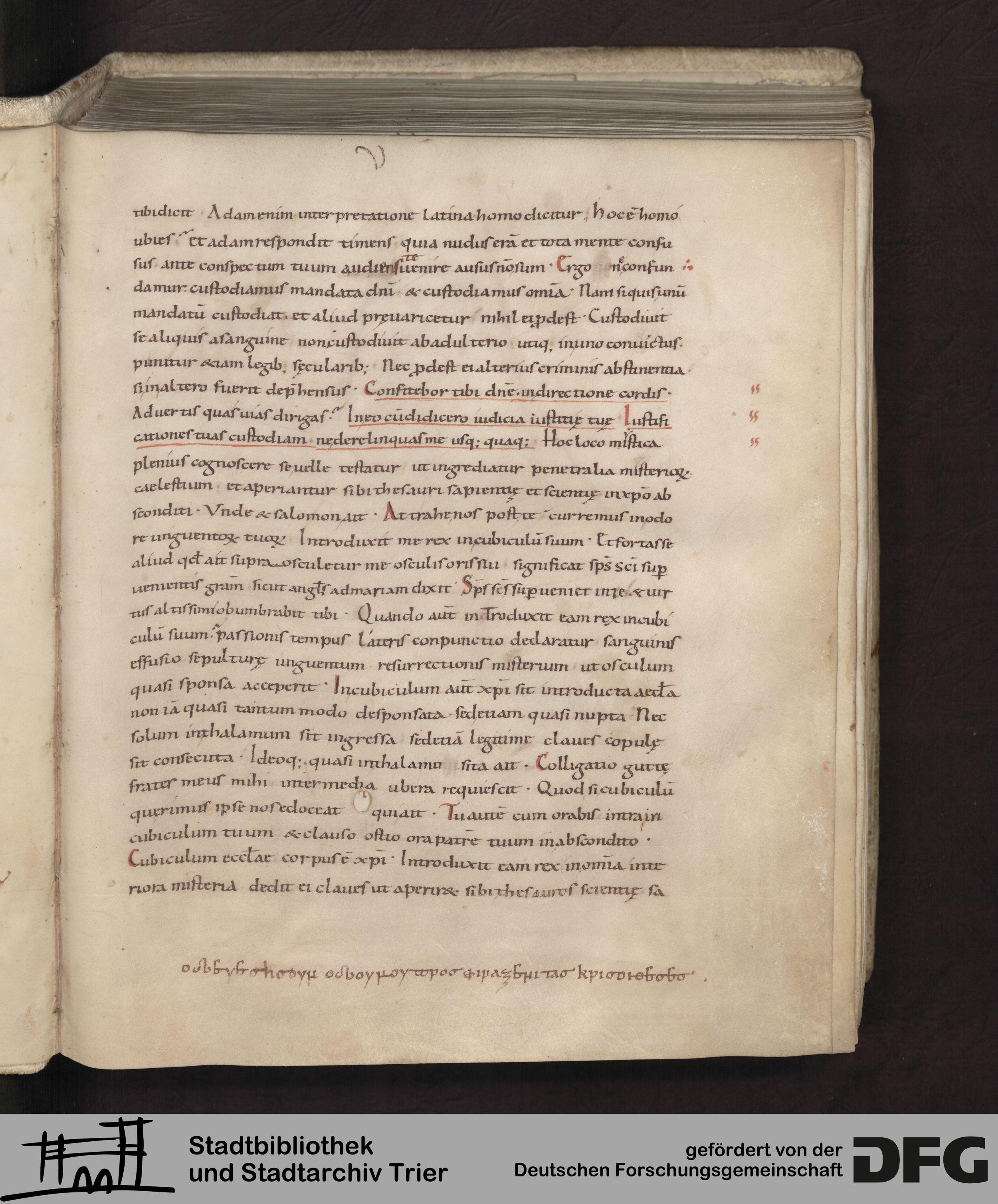 - TextGrid Repository (2017). Stadtbibliothek und Stadtarchiv Trier, Hs. 120/1170 4°: Sammelhandschrift. Inhalte. Stadtbibliothek und Stadtarchiv Trier Hs 120/1170 8°. Ambrosius: Expositio de psalmo. Blatt 5r. Blatt 5r. Virtuelles Skriptorium St. Matthias. Stadtbibliothek und Stadtarchiv Trier. https://hdl.handle.net/11378/0000-0007-E340-0