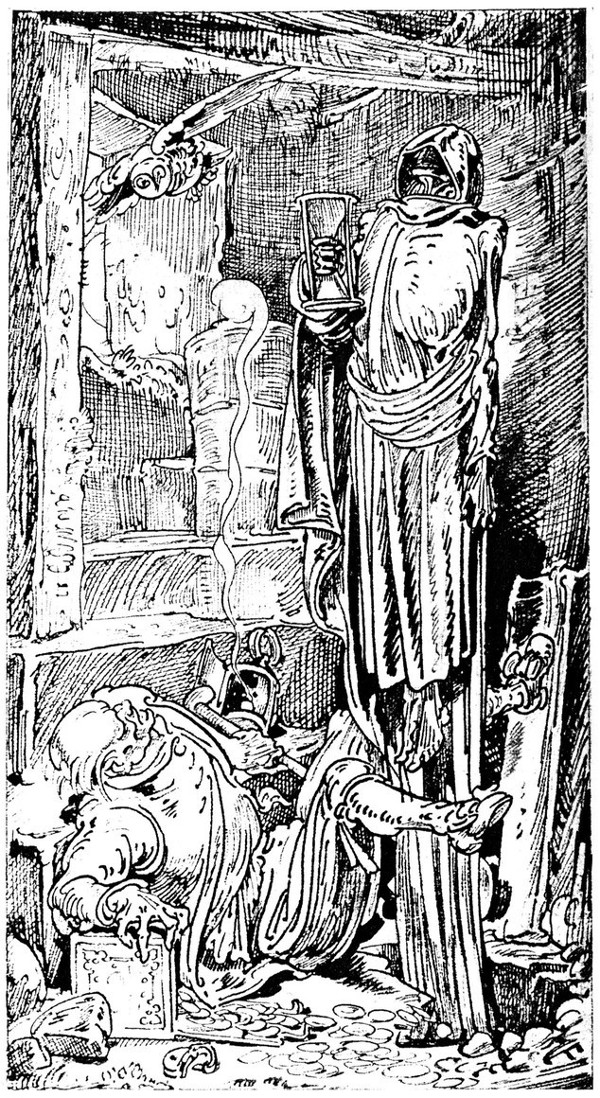 Gegen Abend kam er in eine Stadt, da gingen die Glocken- und als er fragte, was das zu bedeuten hätte, daß die Glocken geläutet würden, so wurde ihm gesagt, es wäre ein armer Mann gestorben, der wäre aber noch zehn Thaler schuldig und nun wollte der, der das Geld zu fordern hätte, es nicht zugeben, daß der Arme begraben würde, es käme denn einer und bezahlte das Geld für ihn. Da ging der Königssohn hin erlegte der arme Mann, der schon lange über der Erde gestanden hatte, kam nun endlich zur Ruhe in seinem Grabe und Königssohn ging allein hinter dem Sarge her.