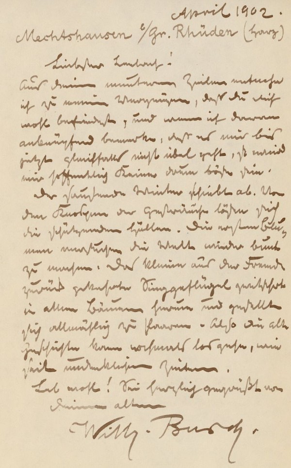 Aus deinen munteren Zeilen entnehm ich zu meinem Vergnügen, daß Du Dich wohl befindest, und wenn ich daran anknüpfend bemerke, daß es mir bis jetzt gleichfalls nicht übel geht, so wird mir hoffentlich Keiner drum böse sein.