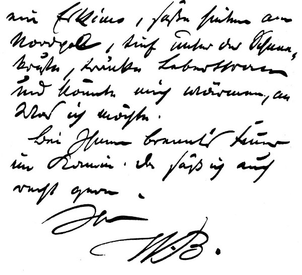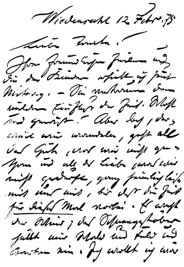 Ihre freundlichen Zeilen und die der Kinder erhielt ich heut Mittag. – Sie vertraun dem milden Einfluß der Zeit. Wohl und gewiß! Aber doch, derweil wir wandeln, geht all das Gute, was wir nicht gethan und all das Liebe, was wir nicht gedurft, ganz heimlich leise mit uns mit, bis daß die Zeit für dieses Mal vorbei. Es weht der Wind; das Schneegestöber hüllt mir Wald und Feld und Garten ein. Ich wollt ich wär ein Eskimo, säße hinten am Nordpol, tief unter der Schneekruste, tränke Leberthran und könnte mich wärmen, an Was ich möchte.