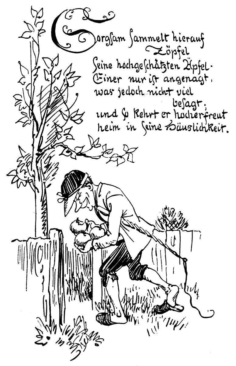 - TextGrid Repository (2012). Busch, Wilhelm. Bildergeschichten. Der Fuchs. Die Drachen.. Die Drachen. Sorgsam sammelt hierauf Zöpfel Seine hochgeschätzten Äpfel. Einer nur ist angenagt, was jedoch nicht viel besagt; und so kehrt er hocherfreut heim in seine Häuslichkeit.. TextGrid Digitale Bibliothek. TextGrid. https://hdl.handle.net/11858/00-1734-0000-0006-272F-F