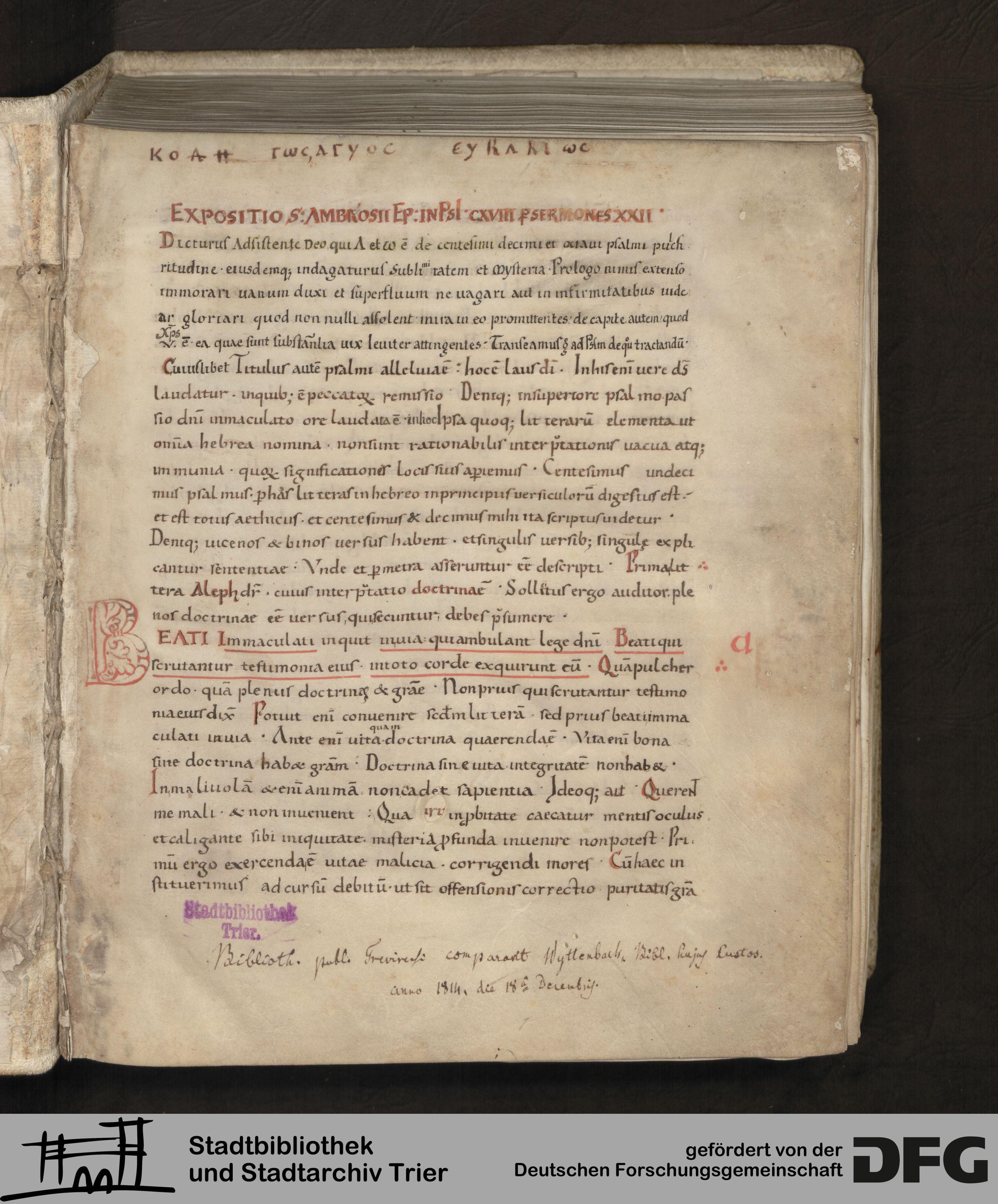 - TextGrid Repository (2017). Stadtbibliothek und Stadtarchiv Trier, Hs. 120/1170 4°: Sammelhandschrift. Inhalte. Stadtbibliothek und Stadtarchiv Trier Hs 120/1170 8°. Ambrosius: Expositio de psalmo. Blatt 1r. Blatt 1r. Virtuelles Skriptorium St. Matthias. Stadtbibliothek und Stadtarchiv Trier. https://hdl.handle.net/11378/0000-0007-E330-2